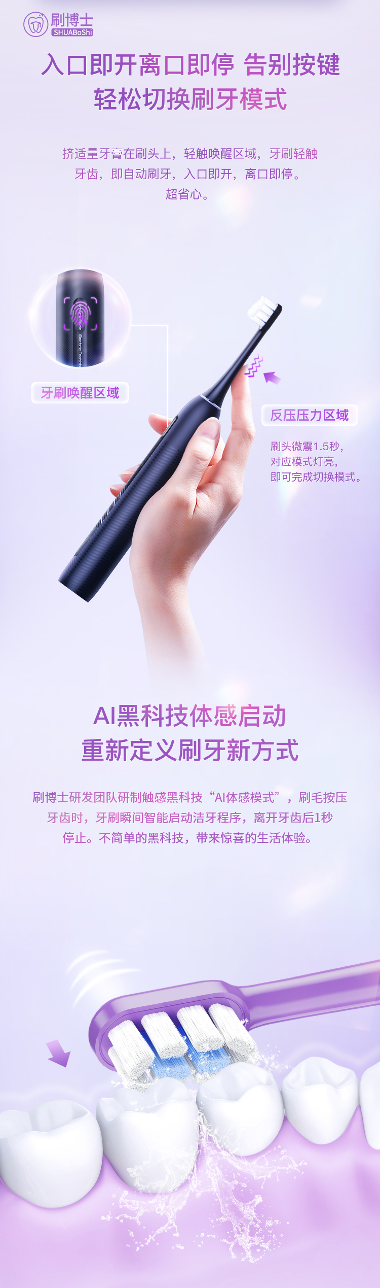 2、智能貼心感應(yīng)設(shè)計(jì),避免牙面泡沫飛濺